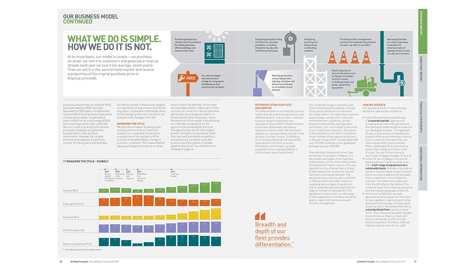 Ashtead is good at describing how it makes money in the first paragraph on page 20. It draws on economic principles to explain the business model, which is does very well by explaining the business cycle and scale economies.